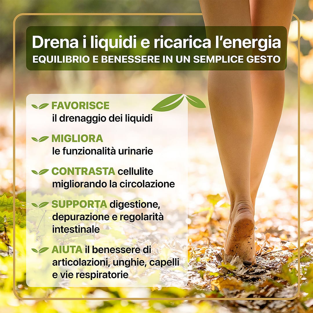 • Drenaggio dei liquidi: riduce gonfiore e pesantezza grazie a Betulla e Pilosella