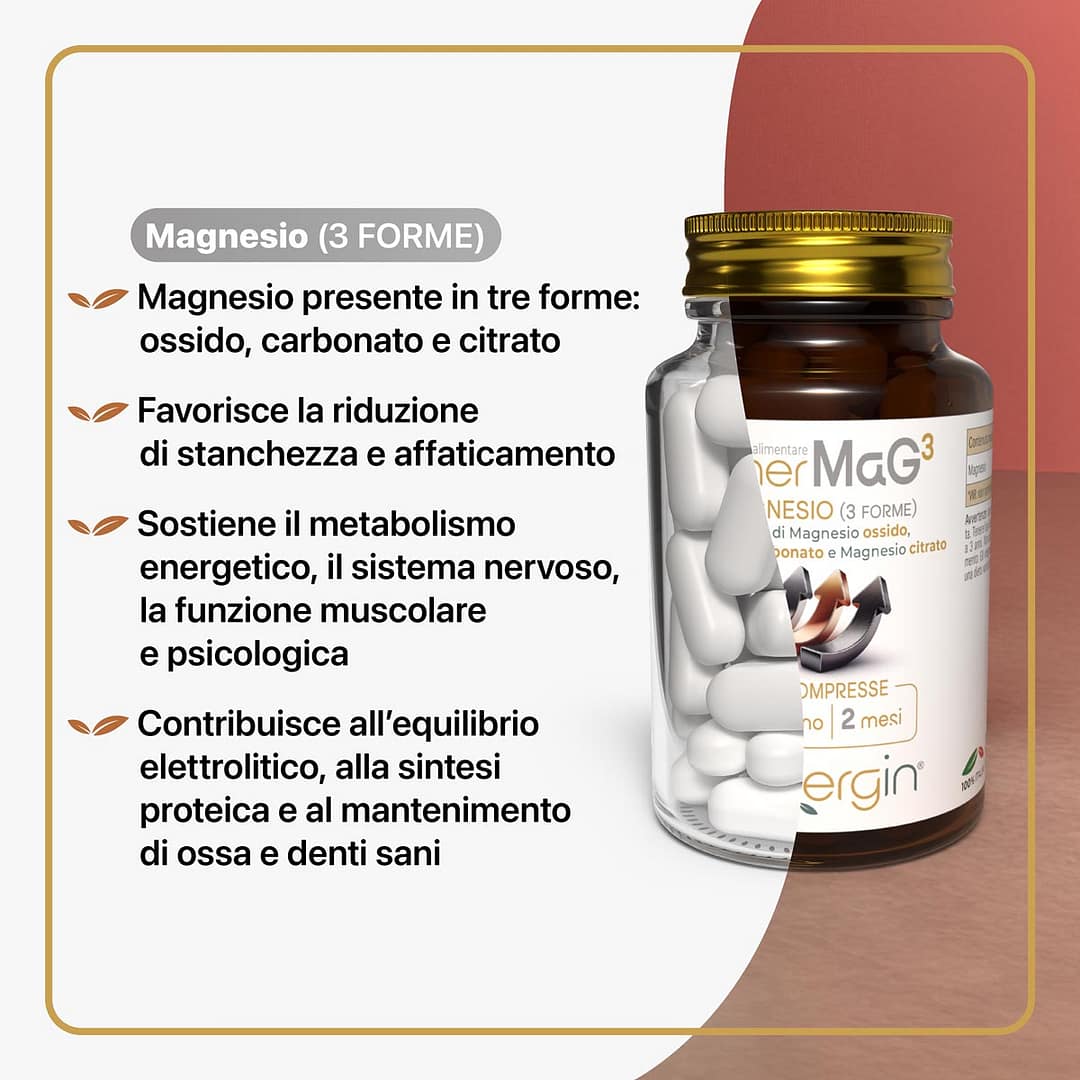 A base di Magnesio in 3 forme (ossido, carbonato, citrato). Riduce stanchezza e affaticamento, supporta il metabolismo energetico e favorisce la funzione muscolare e nervosa.
