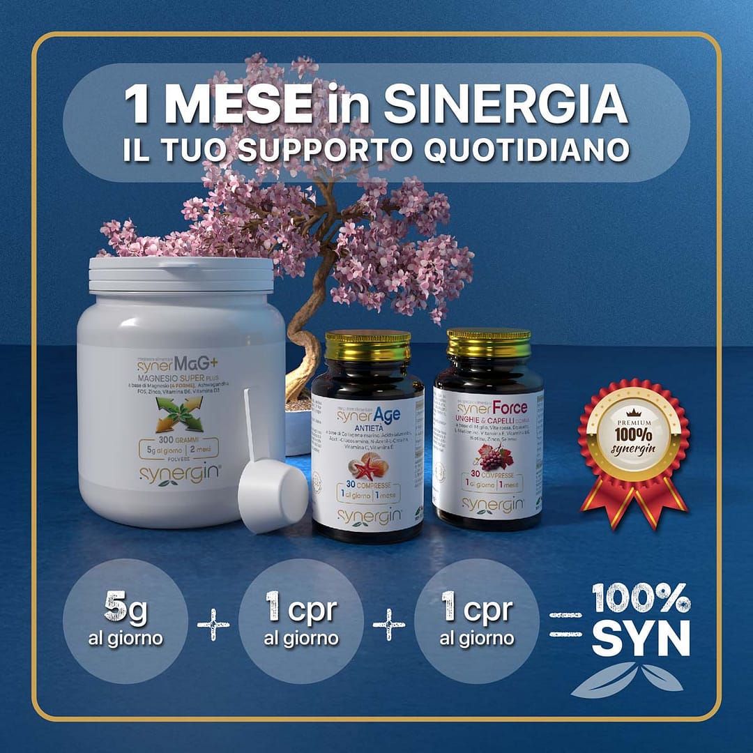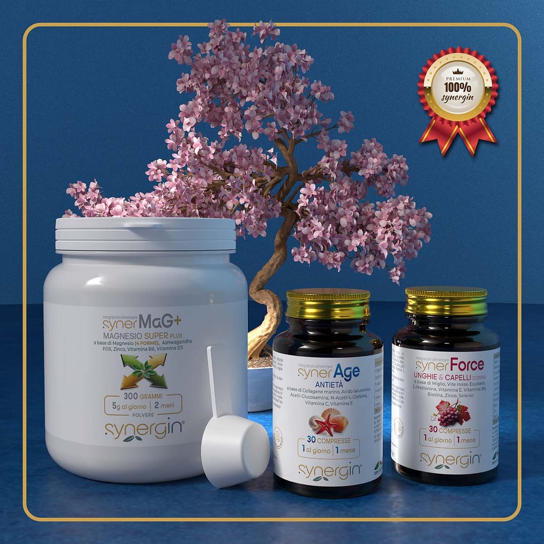 💎 + ⚡ + 🌿 Il synerKit Bellezza & Benessere Donna è il programma completo che unisce synerAge, synerMag+ e synerForce Donna, studiato per supportare la bellezza femminile dall’interno, agendo in modo sinergico su pelle, capelli, unghie, tono ed equilibrio psico-fisico.