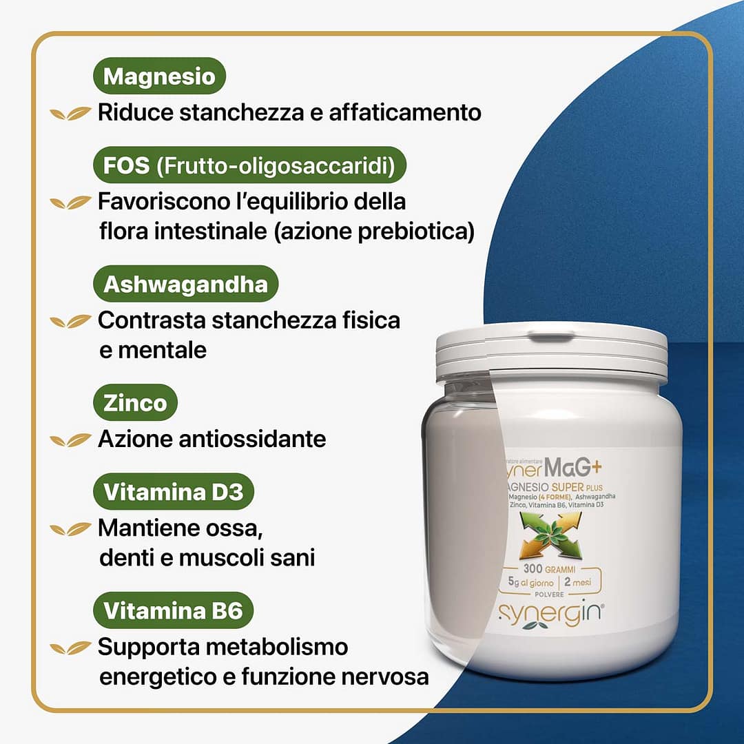 A base di Magnesio (4 FORME), FOS, Ashwagandha, Zinco, Vitamina B6, Vitamina D3. Supporta il metabolismo energetico, il sistema nervoso e aiuta a ridurre stanchezza e affaticamento, favorendo equilibrio e benessere quotidiano.