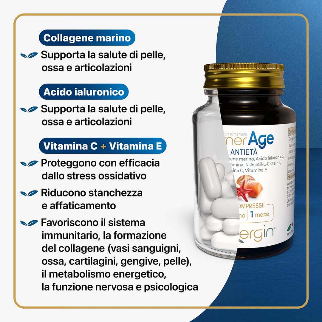 A base di Collagene marino e Acido Ialuronico. Favorisce la formazione di Collagene per pelle, ossa e cartilagini e aiuta a ridurre stanchezza e affaticamento.
