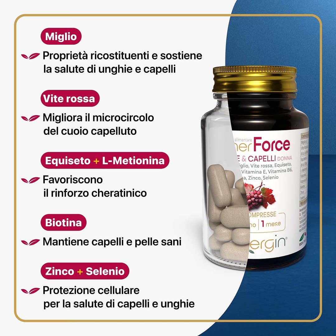A base di Miglio, Vite Rossa, Equiseto, supporta il benessere di capelli, unghie e pelle, contrasta lo stress ossidativo e favorisce il microcircolo, metabolismo energetico e salute cardiovascolare.