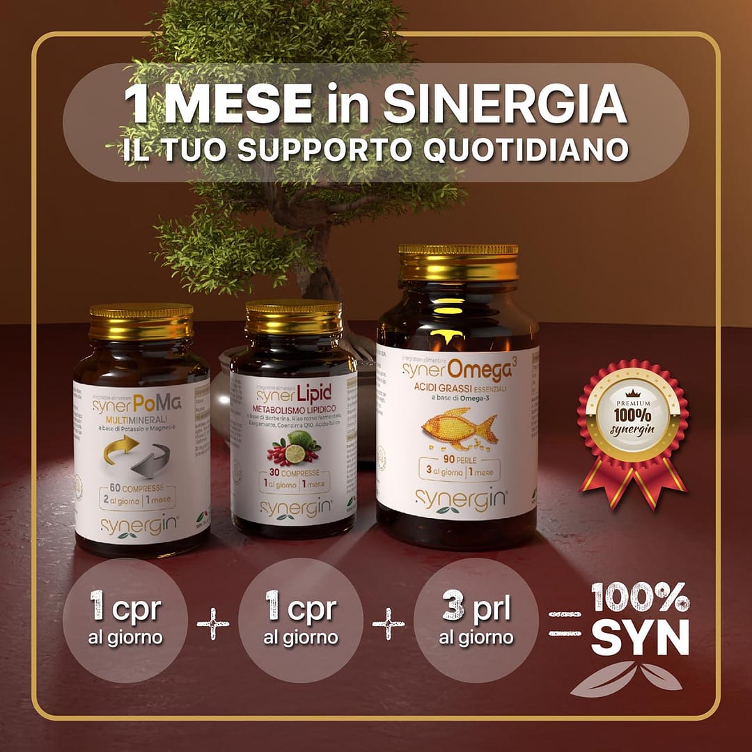 ❤️ + 🛡️ + ✅ Il programma completo che unisce sinergicamente synerLipid, synerOmega 3 e synerPoMa. synerKit Cuore Sano agisce su più fronti: contribuisce al mantenimento di livelli normali di colesterolo, supporta la funzione cardiaca e la pressione sanguigna, e regola l’equilibrio elettrolitico. Una soluzione pratica per prenderti cura del tuo benessere cardiovascolare ogni giorno.