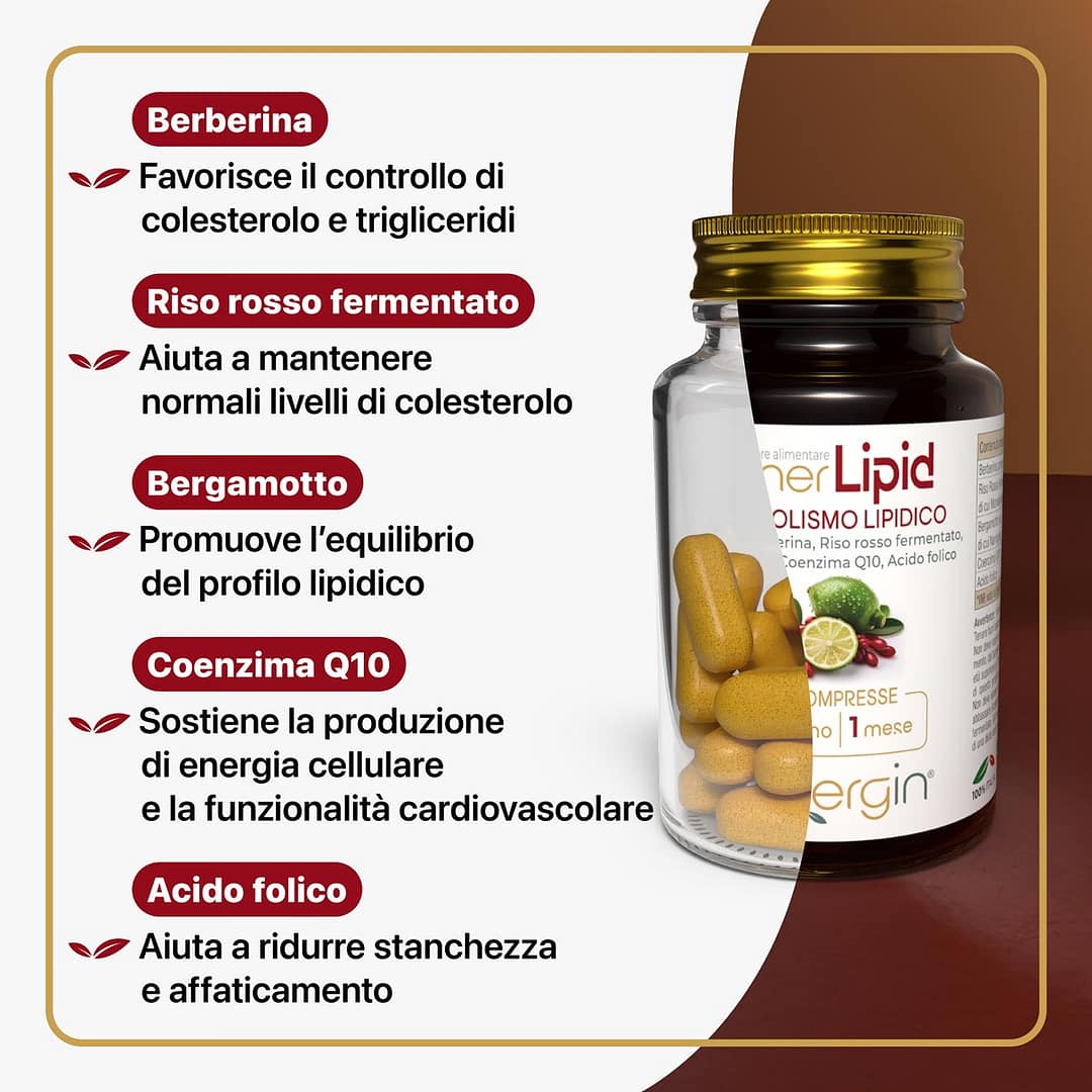 A base di Berberina, Riso Rosso fermentato e Coenzima Q10. Favorisce il controllo del colesterolo, migliora la salute cardiovascolare e aiuta a ridurre la stanchezza.