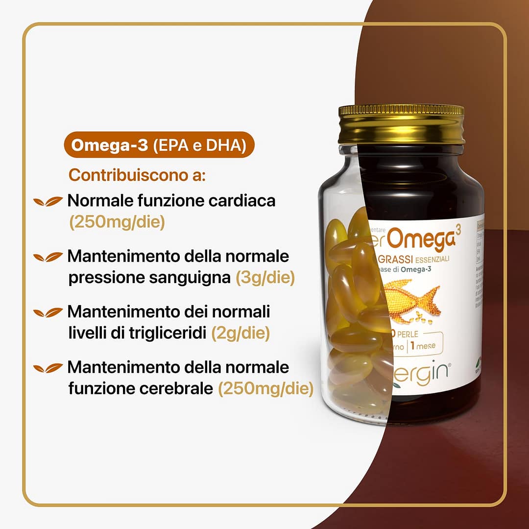 A base di Omega-3 (EPA e DHA). Contribuisce al mantenimento della normale funzione cardiaca, della pressione sanguigna e dei normali livelli di trigliceridi.