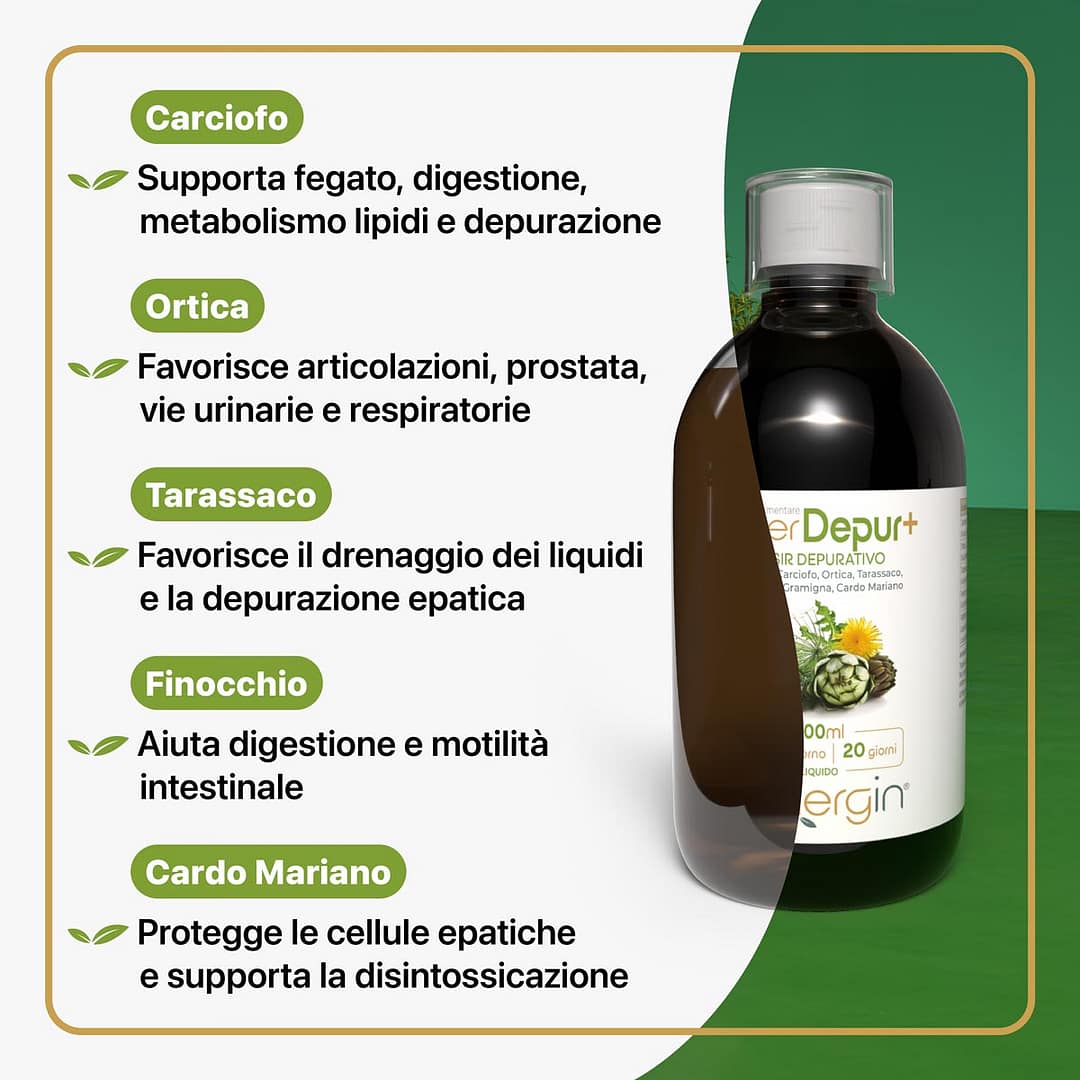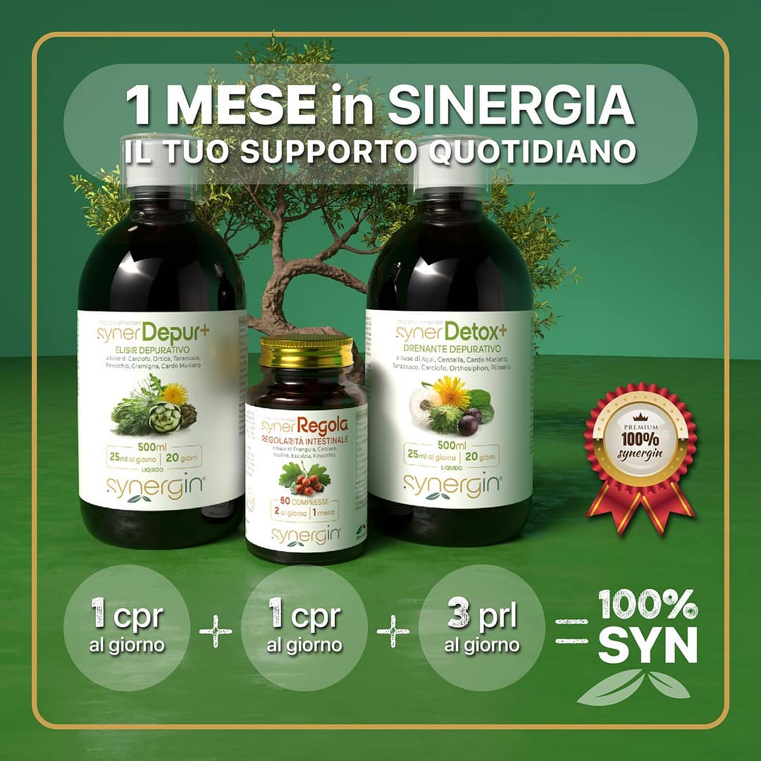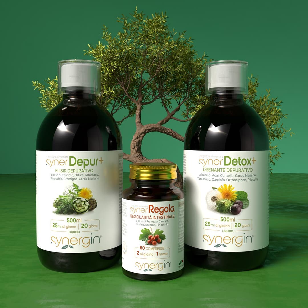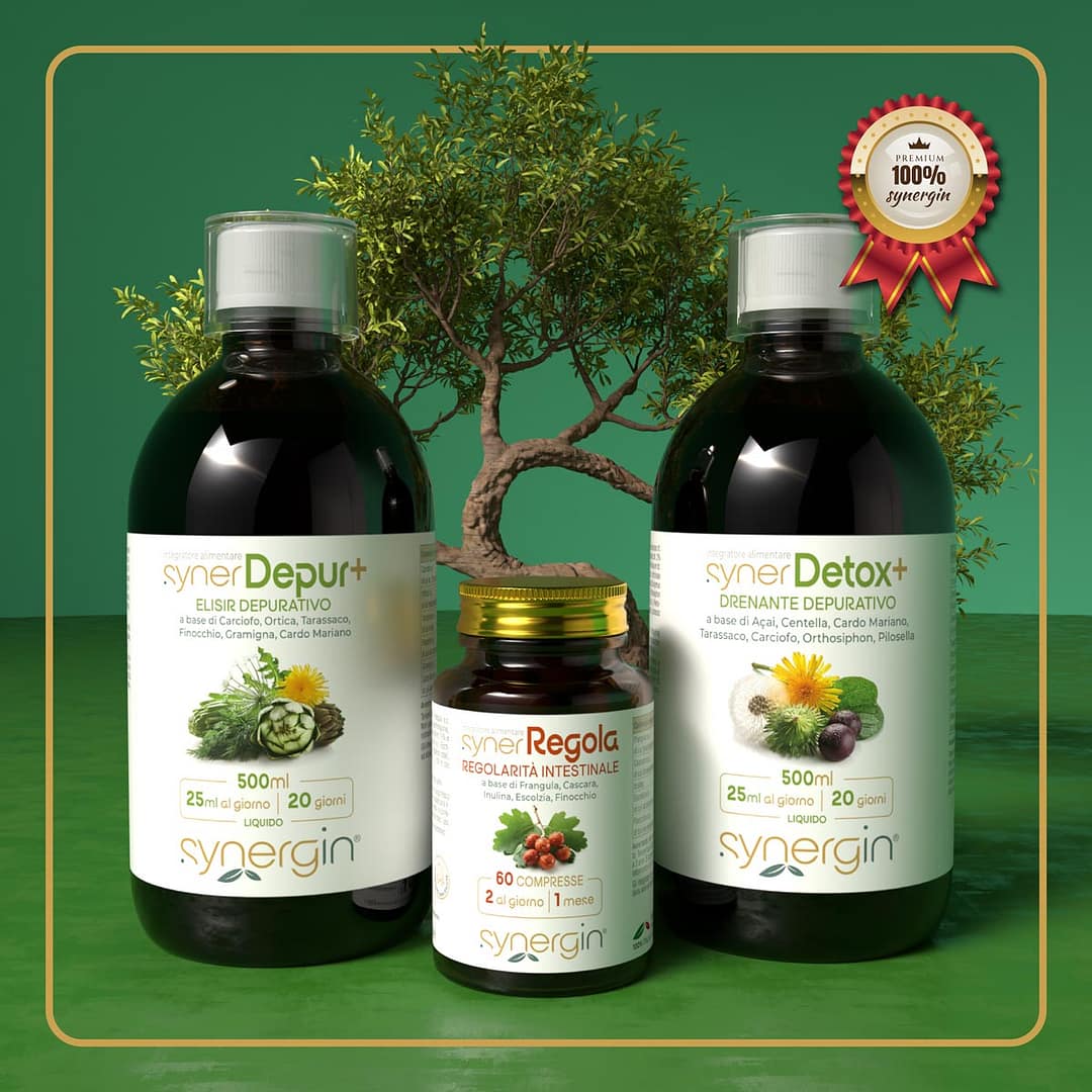 💧 + 🍃 + 🔄 Il programma depurativo con synerDetox+, synerDren+ e synerRegola. synerKit Depurazione Completa depura gli organi emuntori, favorisce l’eliminazione dei liquidi in eccesso e supporta la regolarità intestinale. Promuove una sensazione di leggerezza e benessere generale con ingredienti naturali.