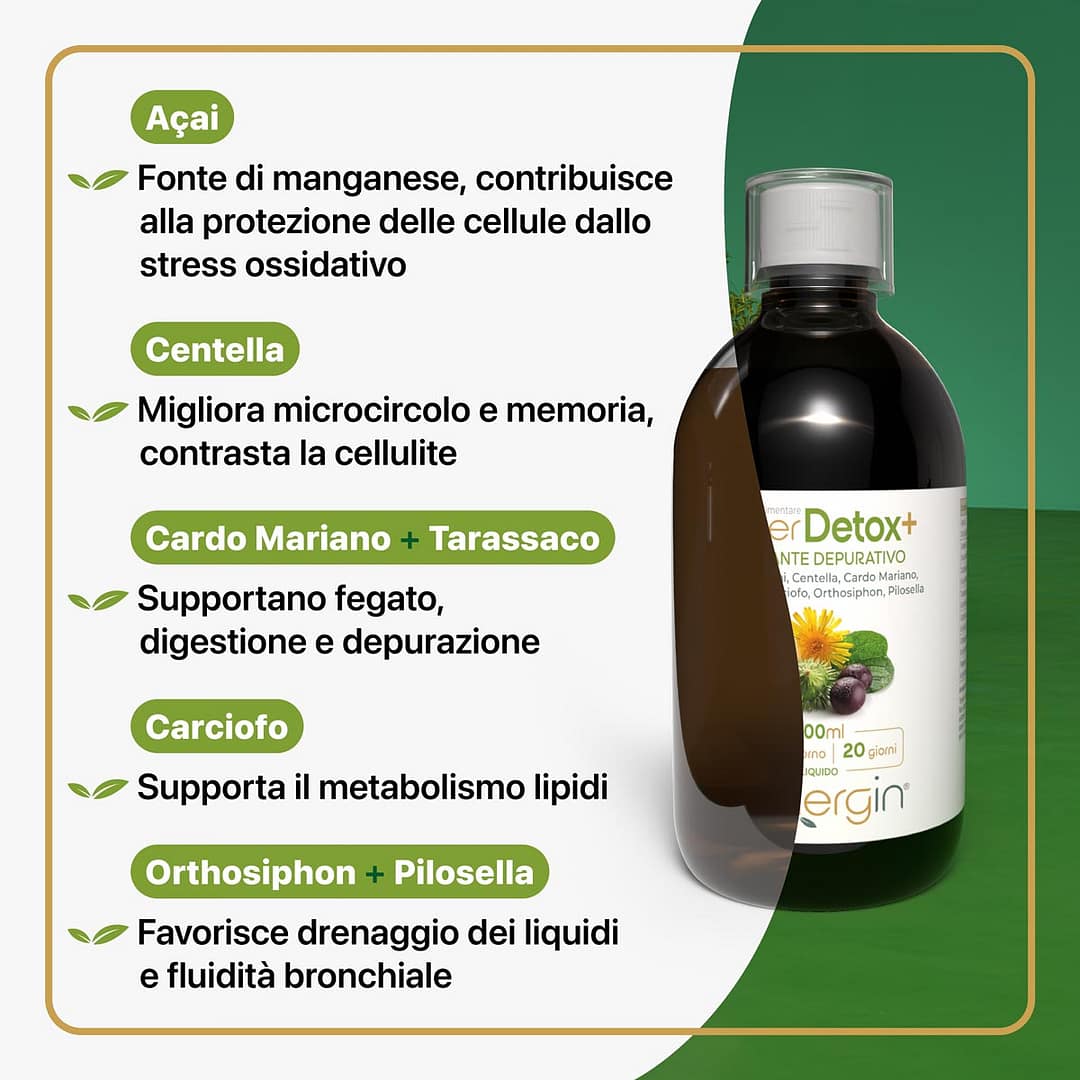 A base di Açai, Centella e Cardo Mariano. Sostiene la funzione epatica e il drenaggio dei liquidi, contrasta cellulite e supporta memoria e funzioni cognitive.