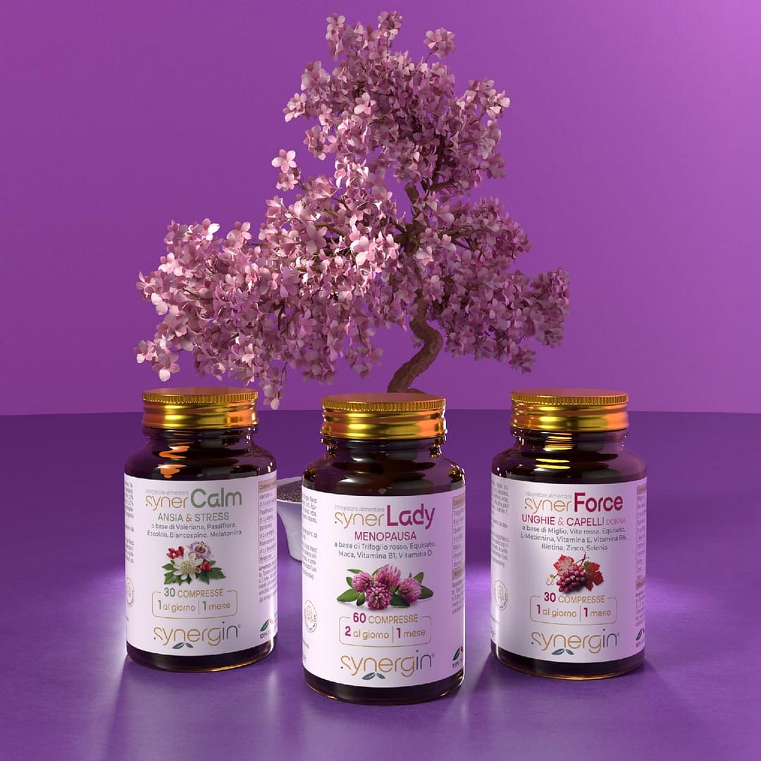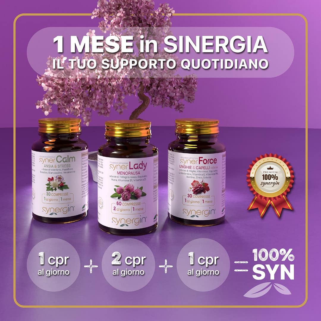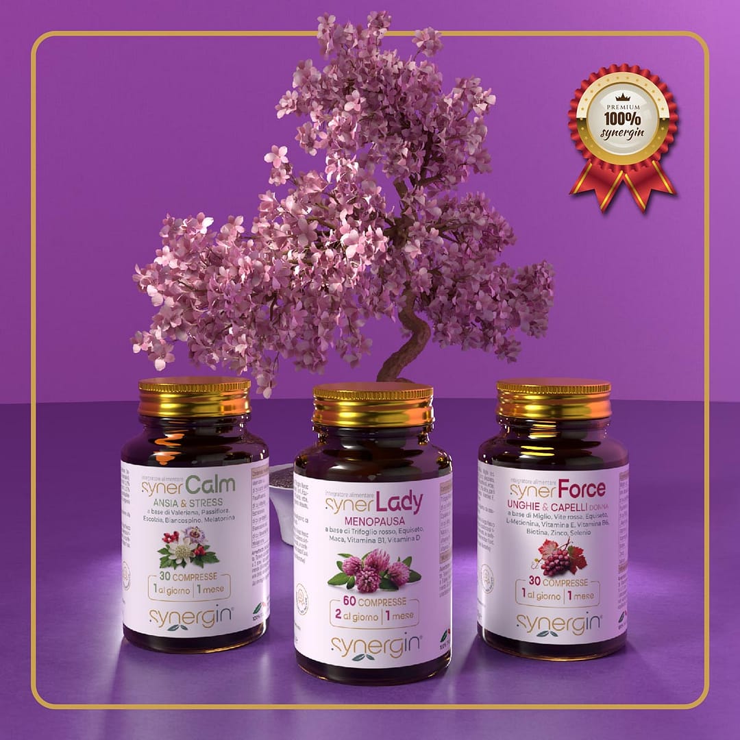 🔥 + 🌧️️ + 🌈 La soluzione con synerLady, synerForce Donna e synerCalm. Affronta i principali disturbi della menopausa bilanciando gli sbalzi d’umore, contrastando le vampate e favorendo il rilassamento. synerKit Equilibrio Donna è il supporto completo anche per la salute di capelli, unghie e qualità del sonno.
