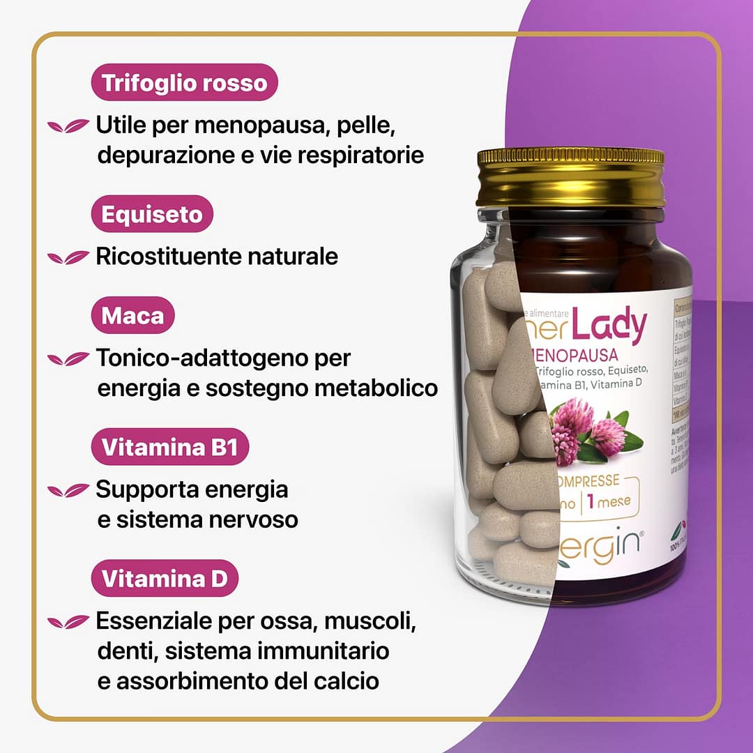A base di Trifoglio Rosso, Maca e Vitamina D. Contrasta i disturbi della menopausa, favorisce tono ed energia e supporta la salute di ossa e muscoli.