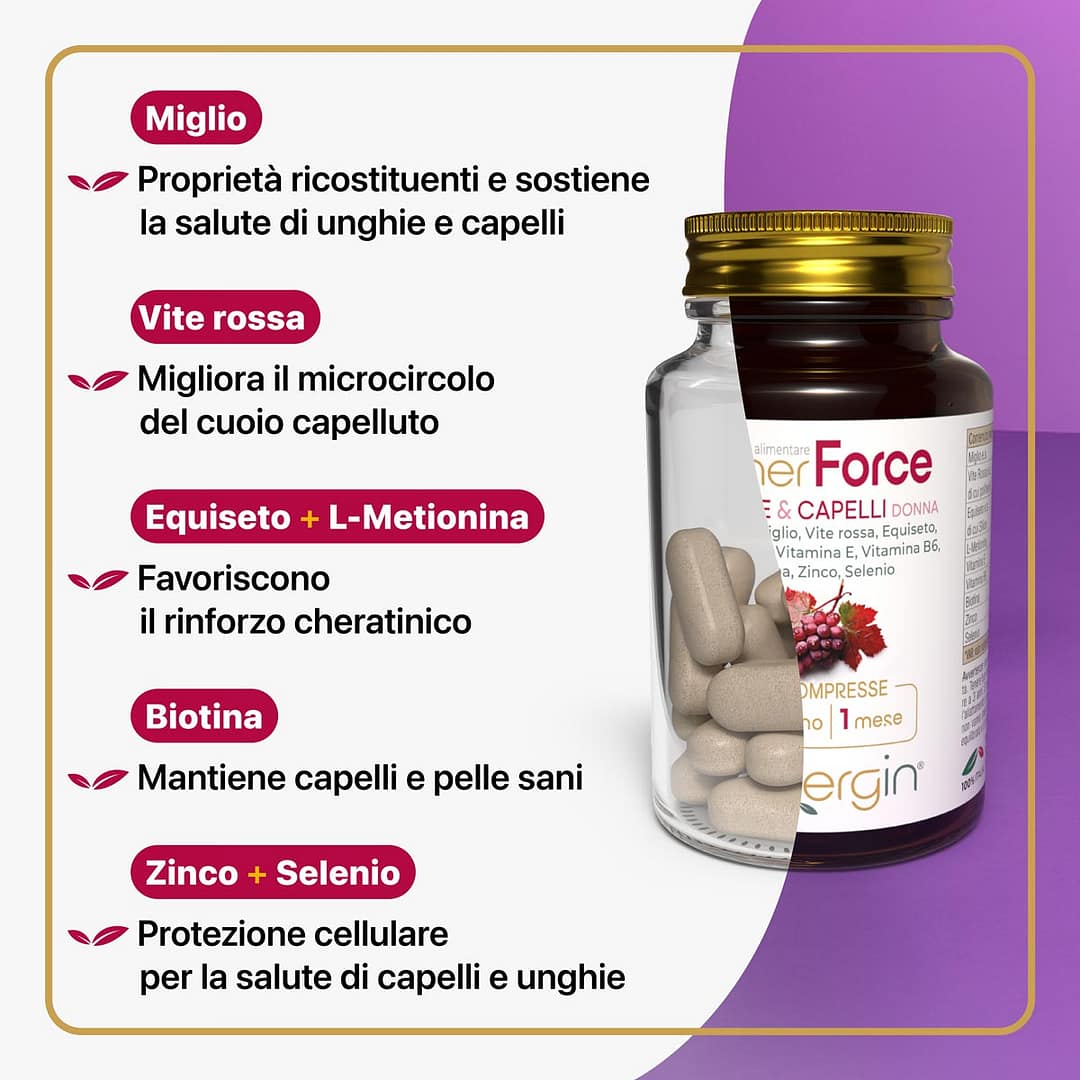 A base di Miglio, Biotina e Zinco. Supporta il benessere di capelli, unghie e pelle, contrasta lo stress ossidativo e favorisce il metabolismo energetico.