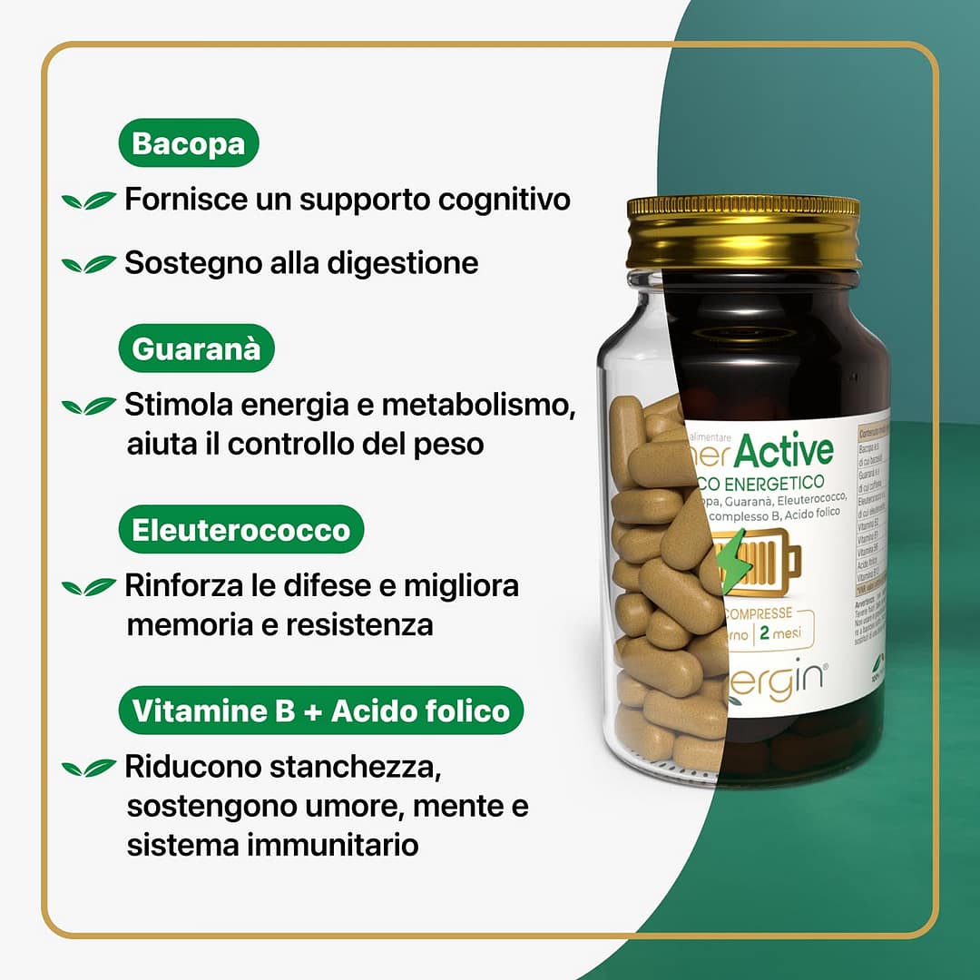 A base di BaA base di Bacopa, Guaranà, Eleuterococco e Vitamine del gruppo B. Favorisce le normali funzioni cognitive, la memoria e il metabolismo energetico, contrastando stanchezza fisica e mentale.copa, Guaranà, Eleuterococco e Vitamine del gruppo B. Favorisce le normali funzioni cognitive, la memoria e il metabolismo energetico, contrastando stanchezza fisica e mentale.