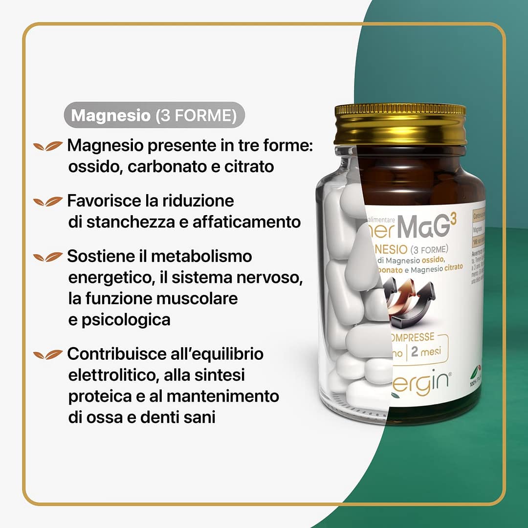 A base di Magnesio in 3 forme (ossido, carbonato, citrato). Riduce stanchezza e affaticamento, supporta il metabolismo energetico e favorisce la funzione muscolare e nervosa.