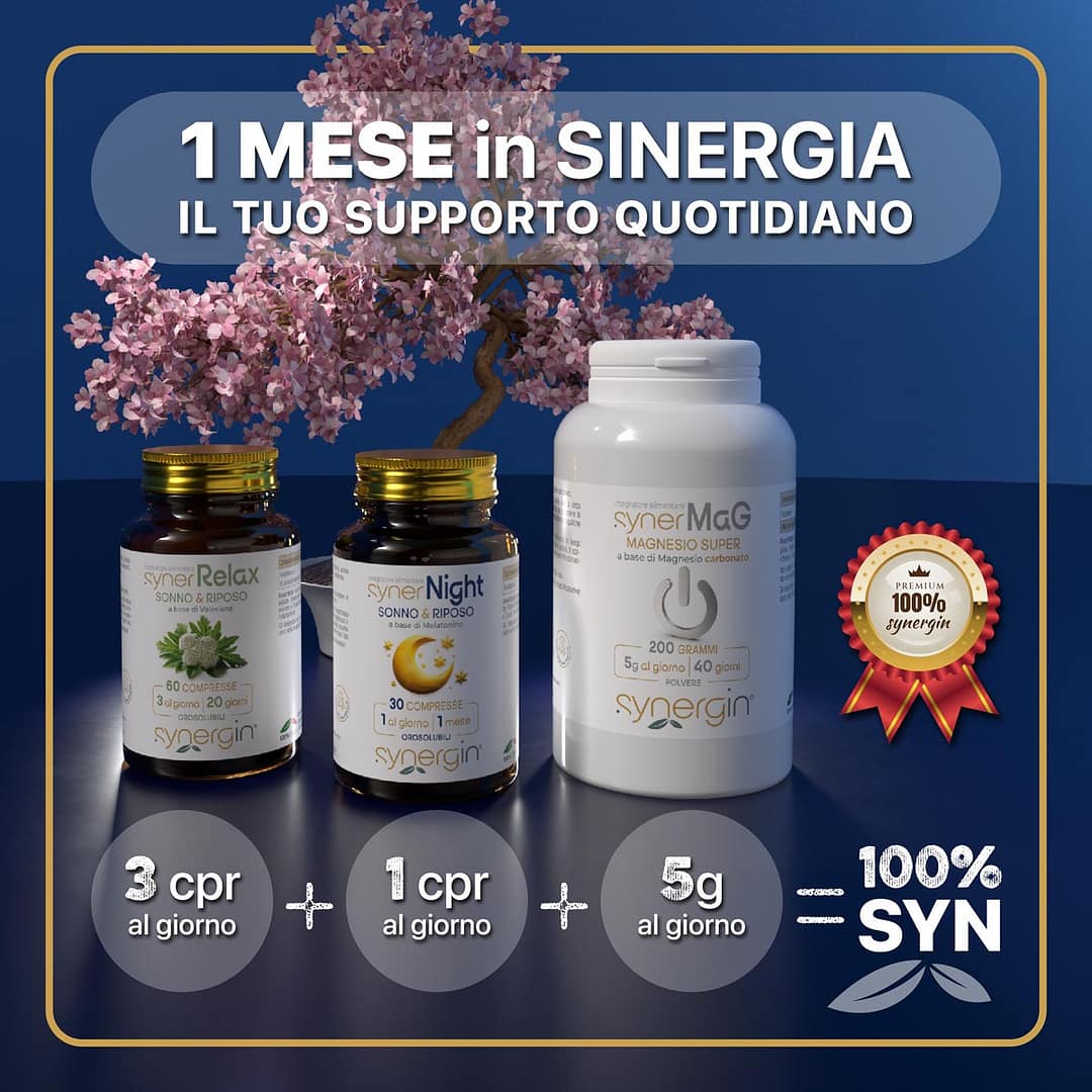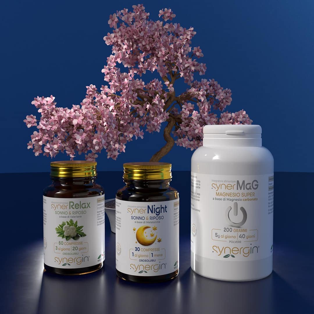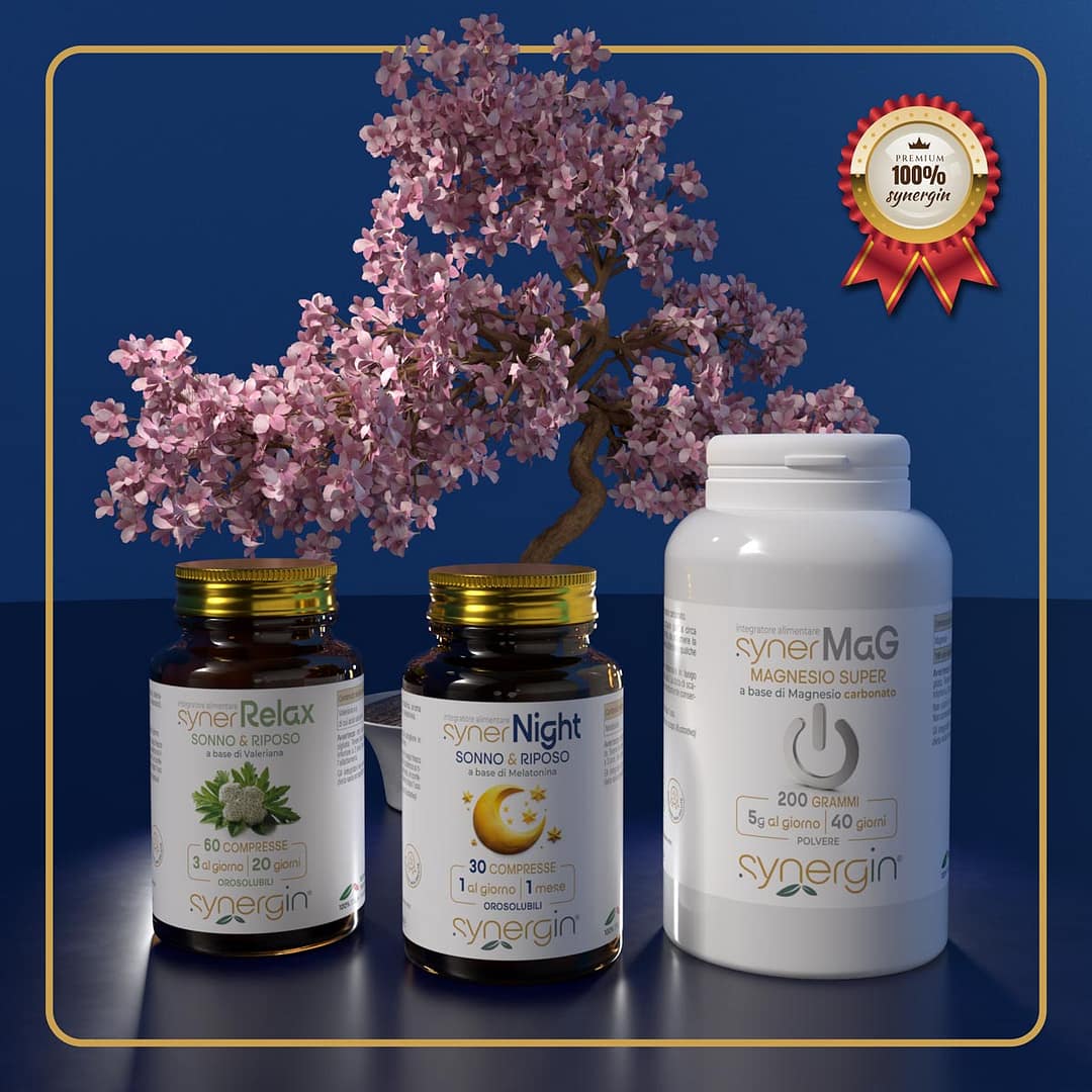 🌙 + 😴 + ⭐ Il percorso con synerNight, synerRelax e synerMaG3. Favorisce un addormentamento rapido, induce rilassamento profondo del sistema nervoso e aiuta la decontrazione muscolare. synerKit Sonno Profondo agisce con azione complementare su 3 fronti per un sonno veramente ristoratore.