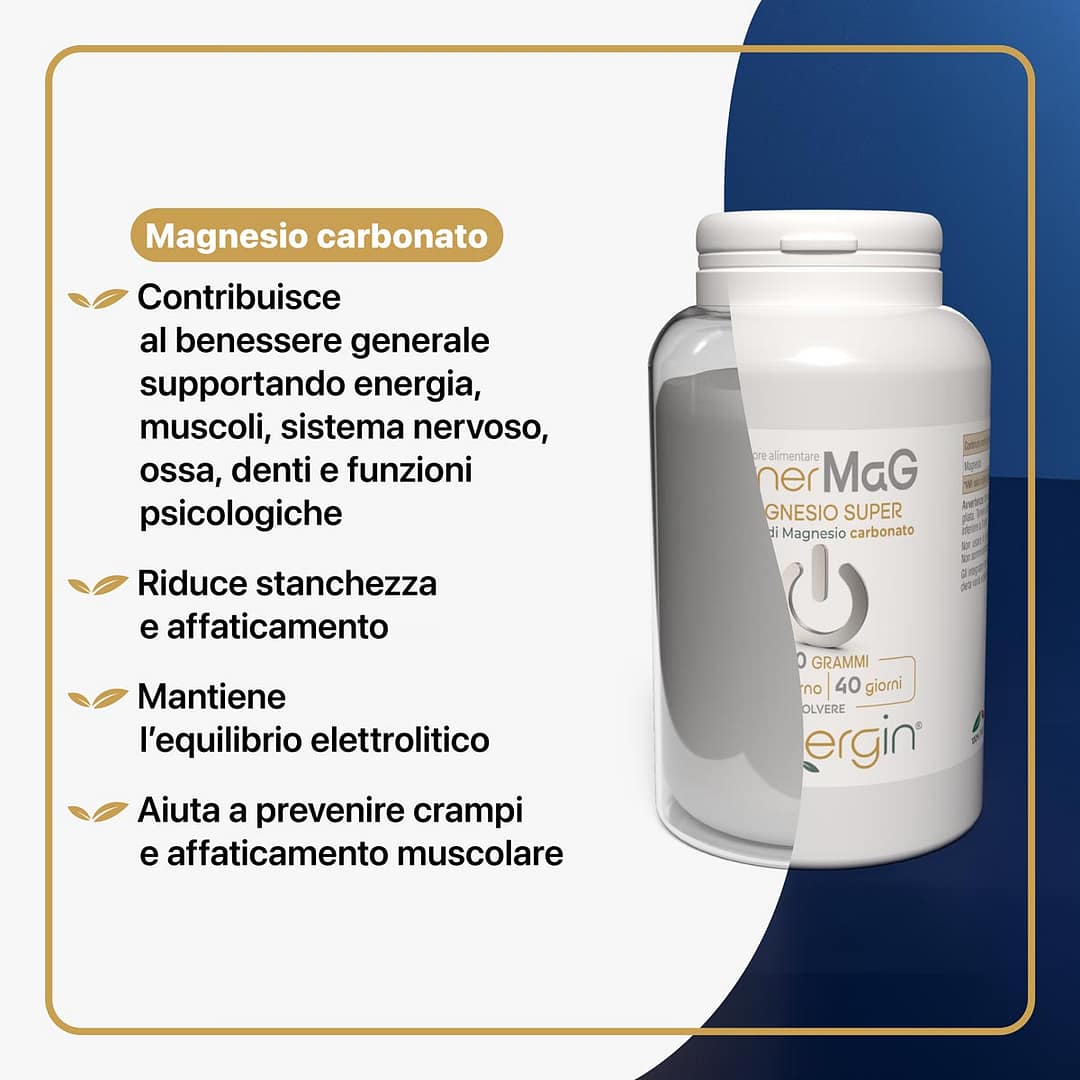 A base di Magnesio Carbonato. Riduce stanchezza e affaticamento, supporta il metabolismo energetico e favorisce la funzione muscolare e nervosa.