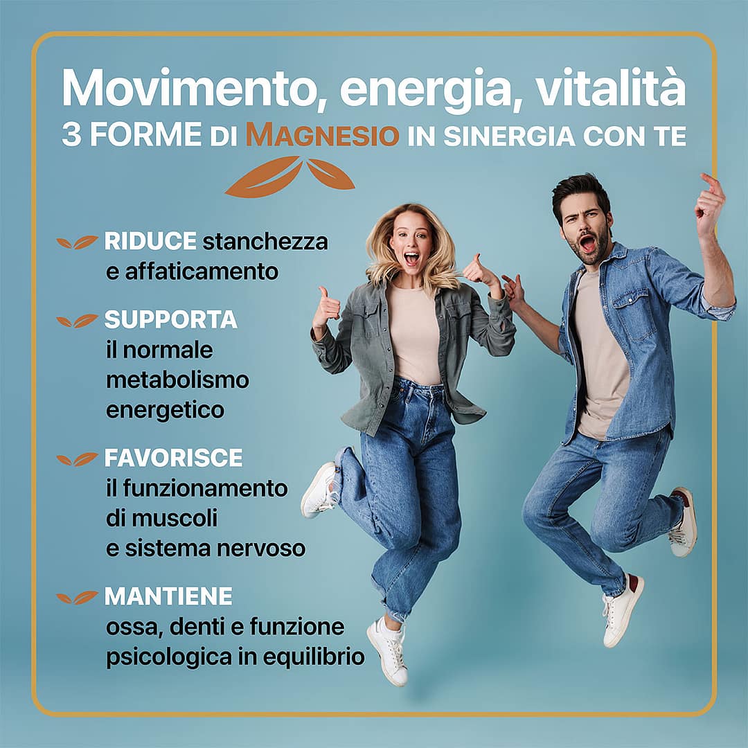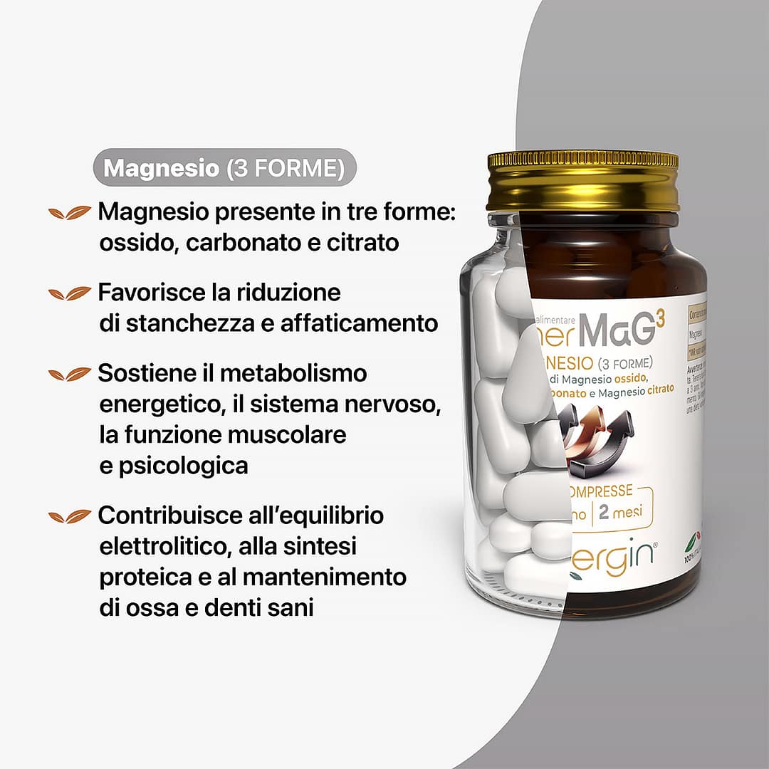 Integratore alimentare a base di Magnesio in 3 FORME (ossido, carbonato e citrato) per un’azione sinergica completa.